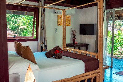 Ce bungalow de 36 m2 est équipé d'un grand lit double et d'un lit simple. Climatisé, avec salle de bain privative et wifi.