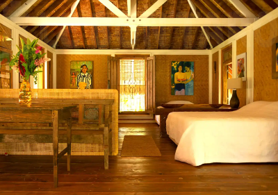 Faré situé à côté de la cuisine commune, équipé de trois lits Queen size, d'une table avec un banc, et d'un canapé d'angle.