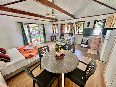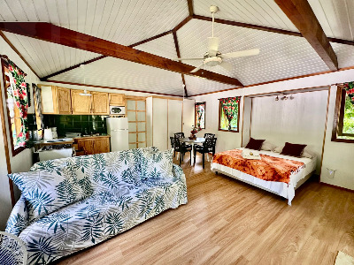 je vous propose mon Faré tropical atiha NOUVEAUTÉ CLIMATISE, de 33m2, totalement rénové, très bien équipé et chaleureux. IL est équipé pour accueillir 3 adultes. La cuisine est tout équipée. Vous disposez d'un coin salon, une connexion internet, climatisation. Vous avez la possibilité de laver votre linge.