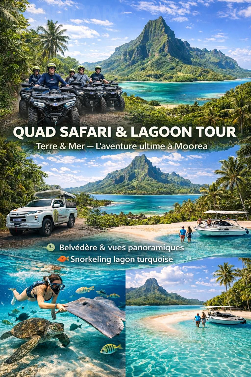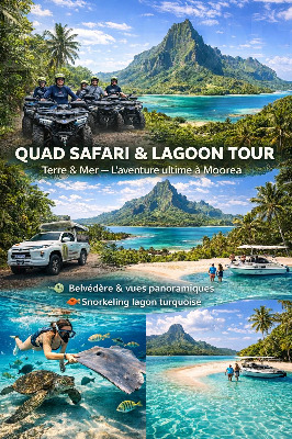 Partez à l’aventure avec Moorea Island Tours ! Découvrez l’île de Moorea comme jamais auparavant grâce à notre combo exclusive Quad + Lagon — la formule parfaite pour allier sensations fortes et beauté naturelle.