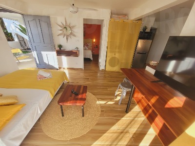Le logement comprend une chambre climatisée avec brasseur d’air, équipée d’un grand lit King Size (180x200 cm), ainsi qu’un salon avec canapé convertible (140x190 cm) et ventilateur.