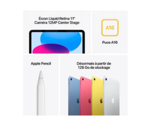 💻 Tablette Internet – Apple A16 – 128 Go – Écran Liquid Retina LED 11″ – Wi-Fi AX / Bluetooth 5.3 – Webcam – Touch ID – USB-C – iPadOS 18