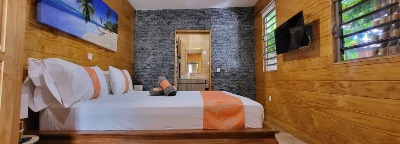 Le bungalow est entièrement équipé pour votre confort : climatisation, réfrigérateur, four, machine à café, télévision à écran plat et rangements.