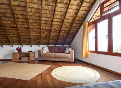 À l’étage, la seconde chambre offre une superbe vue sur le jardin luxuriant et la vallée.