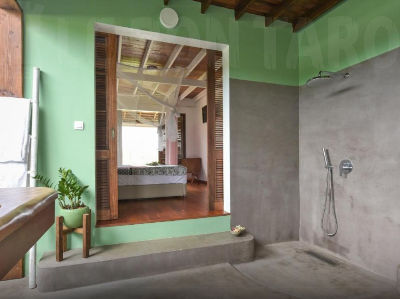 La salle de bain avec jardin intérieur est équipée d’une baignoire et d’une douche à l’italienne, idéale pour un moment de relaxation.