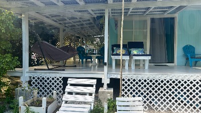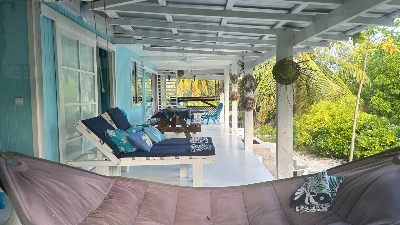 La maison dispose d’une cuisine et d’un salon entièrement équipés, ouverts sur une grande terrasse avec transats, idéale pour se détendre face au lagon.