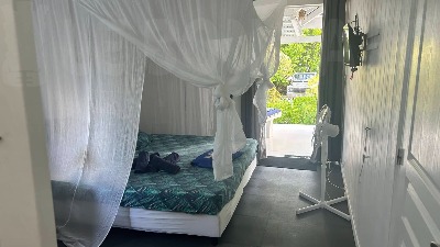 • La chambre Lagon (9 m²) avec lit double (140 cm) et salle de bain privée située à proximité